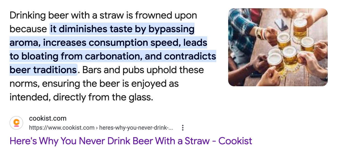 A brief perusal of Reddit and the horrible Google search AI suggests that drinking beer with a straw is bad because there are different levels (?) and aromas to the beverage.