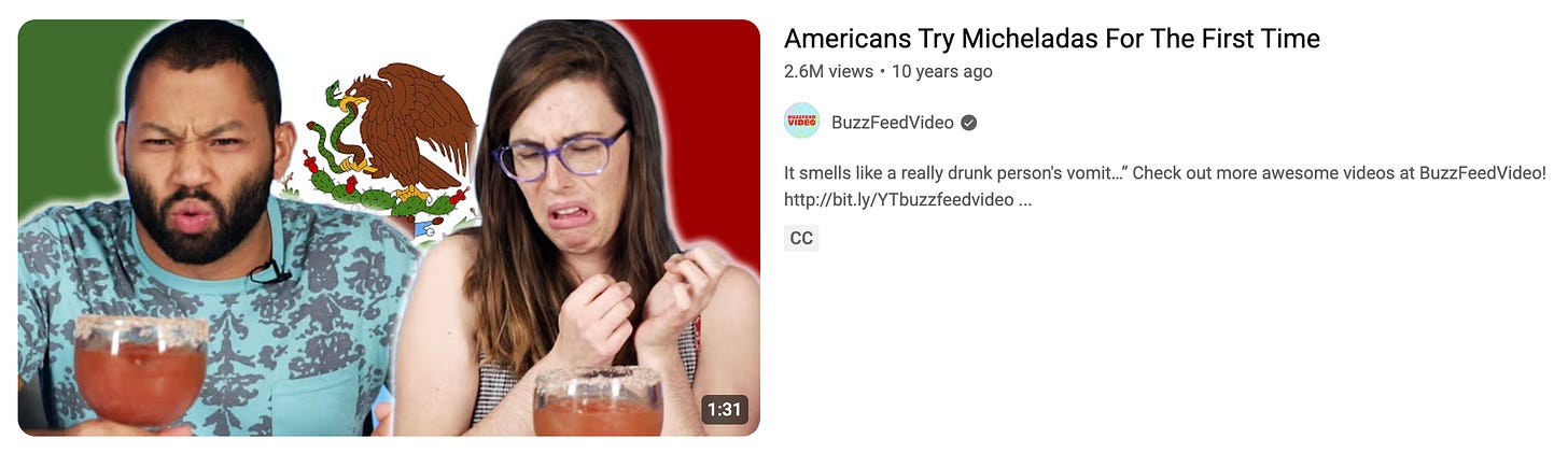 Occasionally I meet people who have never had a michelada. This is crazy to me, because they are kind of everywhere, but that’s fine. A michelada is a Mexican beverage (typically) made with a Mexican lager with clamato juice and ice plus some other stuff (Worcestershire sauce, hot sauce, fish sauce, tajin, lime, whatever) with a salt and/or tajin rim. They are easy to make at home and require no actual skill. As someone who likes to have clamato juice around the house anyway3, this is one of the easiest things to make. I am not a big drinker — alcohol, generally, is a migraine trigger — but I do like to indulge in the odd dinnertime michelada if all the ingredients are there and Phil feels like making them.4